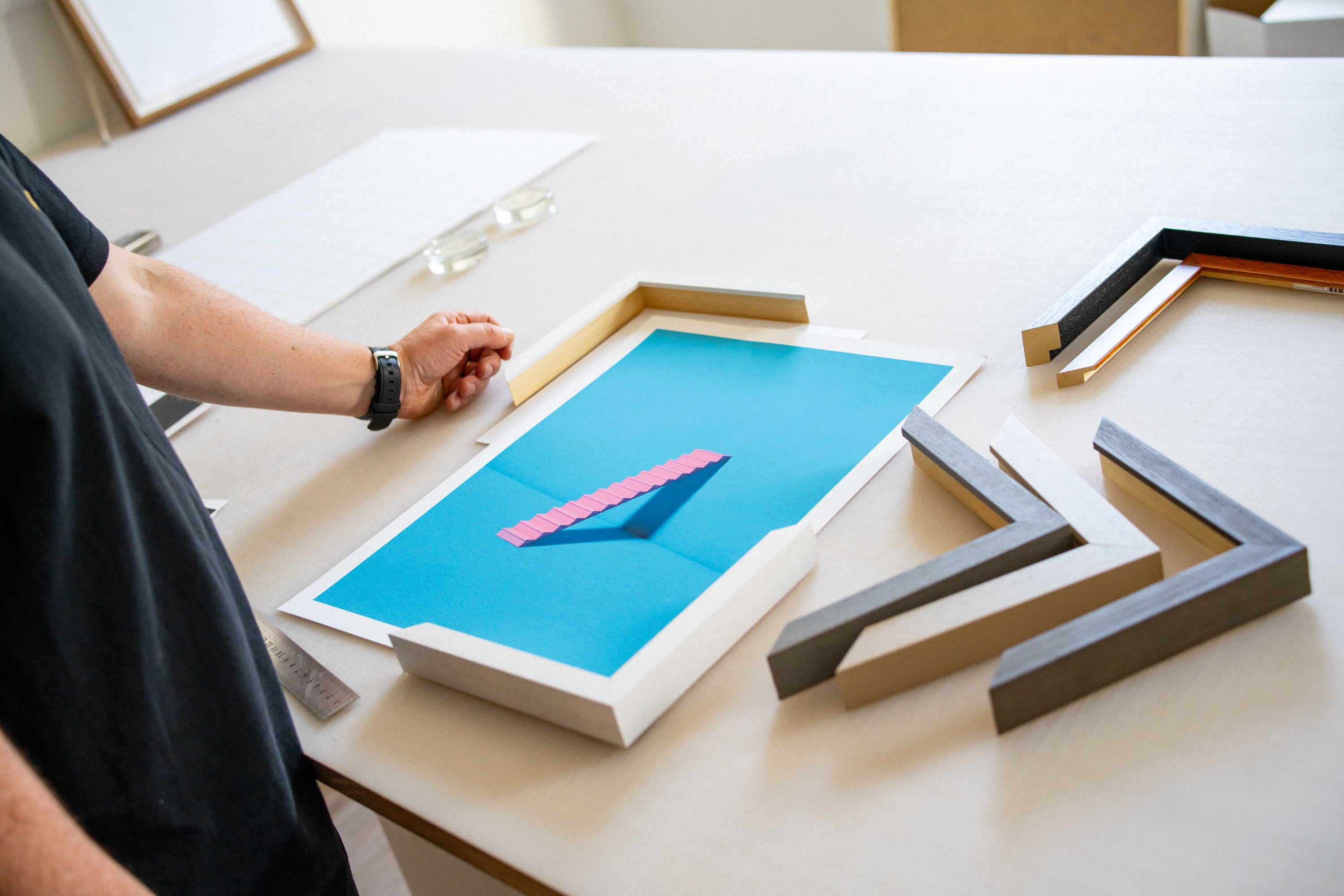 Expertly position your artwork within the mat board and frame for a visually pleasing effect.